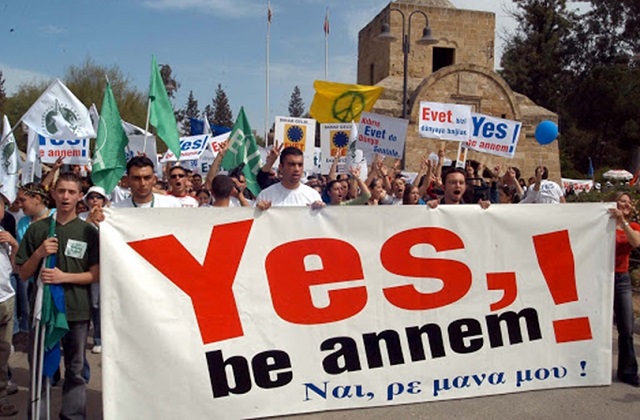 ‘Annan Planı’ referandumu döneminde, Kıbrıslı Türk çözüm yanlıları ‘Yes be annem’ sloganını kullanmıştı. [AA]