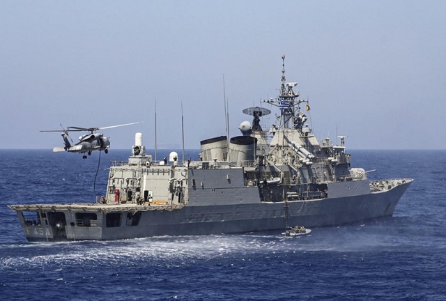 Yunan donanmasına ait bir firkateyn ve helikopter 25 Ağustos tarihinde Doğu Akdeniz’de icra edilen tatbikat esnasında görülürken. Kaynak: Yunanistan Savunma Bakanlığı/AFP