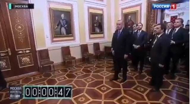 Kremlin’de Putin ile görüşmeyi bekleyen Erdoğan ve beraberindeki Türk heyeti. Görüntüler hükümet haber ajansı Russia 1 tarafından yayınlanmıştır. Kaynak: See News