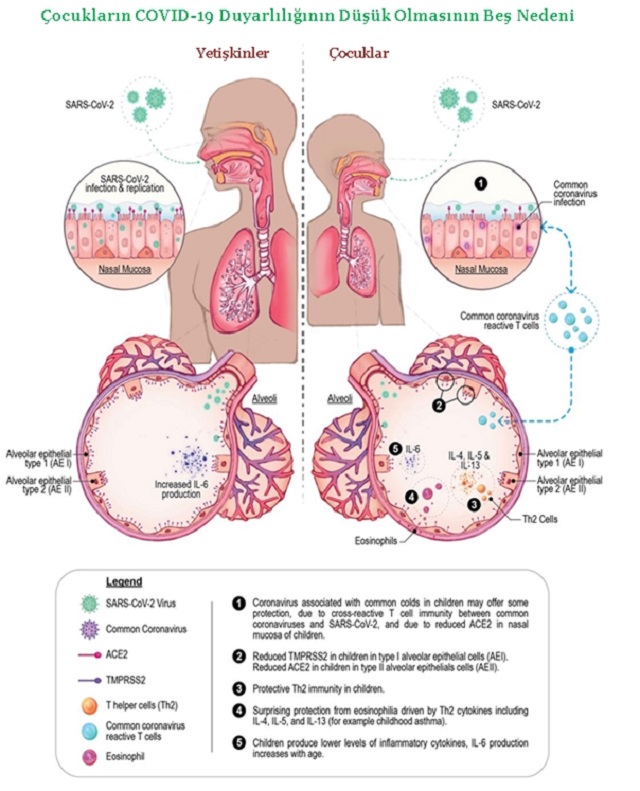5. Çocuklar ve yetişkinler SARS-CoV-2 bulaşına karşı çok çeşitli ve farklı bağışıklık sistemi tepkileri sergiler, bu da onların COVID-19 hastalığından neden çok daha az hastalık veya ölüm oranlarına sahip olduklarını açıklamaya yardımcı olmaktadır.
