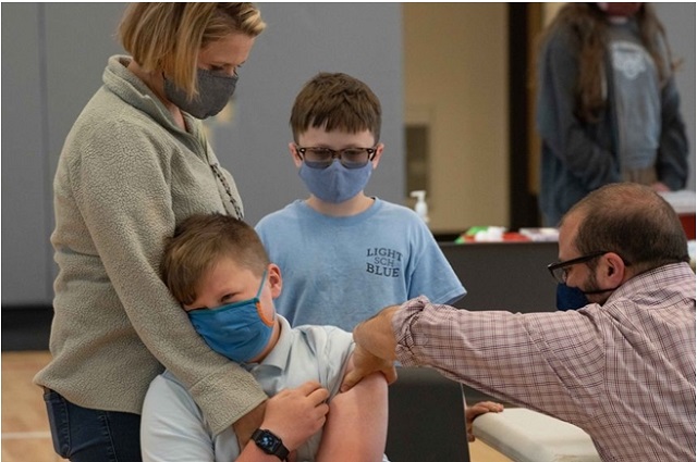 Henry Cantlin’e (12) 14 Mayıs 2021 tarihinde COVID-19 aşısı uygulanırken, Philadelphia. Fotoğraf: Jim Z. Rider / Zuma Press.