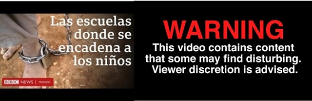 Solda BBC NEWS’de İspanyolca ‘‘Çocukların Zincire Vurulduğu Okullar’’, sağda İKAZ, Bu video görüntüleri bazılarının rahatsız edici bulabileceği görüntüler içermektedir. İzlemek izleyicinin takdirine bırakılmıştır.