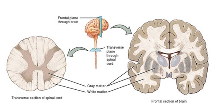 İnsan beynindeki gri ve beyaz maddeler – Gri madde serebral korteksin yüzeyinde bulunur ve ayrıca talamus ve bazal ganglionlar gibi derin beyin yapılarını da içerir. Beyaz madde, serebral korteksin gri maddesinin altında bulunur ve bilginin işlenmesinin gerçekleştiği gri madde bölgeleri arasında bilgi aktarımından sorumlu olan uzun nöral yolları içerir.
