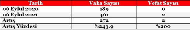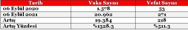 Sağlık Bakanlığı COVID-19 Bilgilendirme Platformu verilerine göre 06 Eylül 2021 günü vaka sayısı 20.962, vefat sayısı 271’dir. Bir yıl önce aynı gün toplam vaka sayısı 279.806, vefat sayısı ise 53’tür. Sağlık Bakanlığı, 17 Mart 2020 tarihinde paylaşmaya başladığı verilerde; 03 Temmuz 2021 tarihine kadar birikmiş toplam vaka sayısını vermiş ve bu tarihten itibaren de günlük veri açıklama uygulamasına geçmiştir.