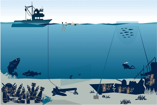 Denizlerin dibindeki mühimmat; gemiler, balıklar ve deniz ekosistemine zarar vermektedir. Fotoğraf: Forsvarets Forskings Institut