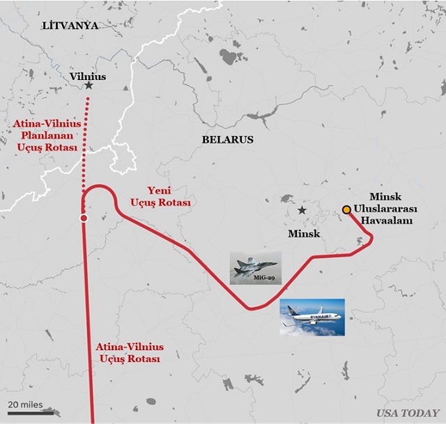 Ryanair havayollarına ait 4978 sefer sayılı yolcu uçağı Litvanya hava sahasına girmek üzereyken aniden Belarus’un başkenti Minsk kentine yönlendirilir. Yunanistan’ın Atina kentinden kalkan yolcu uçağı, Litvanya’nın Vilnius kentine gitmektedir ve Belarus hava sahasını güney-kuzey istikametinde kat eden uçak neredeyse Litvanya hava sahasına girmek üzeredir.