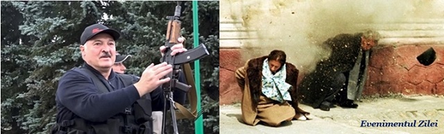 Solda; yeni seçimler için ‘‘Beni öldürmek zorundasınız’’ diyen Belaruslu diktatör Alexander Lukashenko halkına gözdağı vermek için elinde silahla poz verirken görülmektedir. Sağda ise kaçarken yakalanıp, bir saatten az süren bir yargılamanın ardından soykırım suçuyla ölüm cezasına çarptırılan ve görkemli sarayının avlusunda, dondurucu soğukta, tuvaletin hemen yanında karısı Elena ile birlikte, 25 Aralık 1989 günü kurşuna dizilerek idam edilen Romanyalı diktatör Nicolae Ceausescu. Birbirlerini çok seven Romanyalı diktatör ve karısı, ayrı infaz kararına rağmen birlikte kurşuna dizilmeyi talep etmiş ve son arzuları üç kişilik ölüm timi tarafından yerine getirilmiştir.