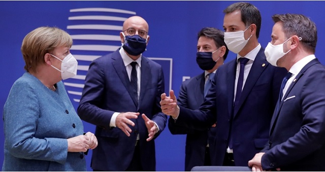 Almanya Şansölyesi Angela Merkel,  Avrupa Konseyi Başkanı Charles Michel, İtalya Başbakanı Giuseppe Conte, Belçika Başbakanı Alexander De Croo ve Lüksemburg Başbakanı Xavier Bettel, Avrupa Konseyi zirvesi öncesinde, COVID-19 salgınının başladığı günden beri ikinci yüz yüze konuşurlarken. 01 Ekim 2020. Kaynak: Olivier Hoslet/Al Jazeera