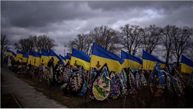 Kyiv kenti yakınlarındaki Brovary Mezarlığı’nda yeni kazılmış mezarların üzerinde dalgalanan Ukrayna bayrakları, Birleşmiş Milletler verilerine göre savaşın başladığı günden bu yana en az 8.000 sivil (en az 487 çocuk) hayatını kaybetmiştir, 13.000 sivil de yaralanmıştır. Fotoğraf: AP Photo/Emilio Morenatti.