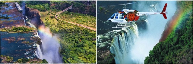 Zambiya ve Zimbabwe arasındaki sınırı oluşturan Zambezi nehrinin derin bir boğaza döküldüğü iki kilometre uzunluğundaki şelale dünyanın en etkileyici ve görkemli yerlerinden bir tanesidir. Şelale üzerinde oluşan buğu ve gökkuşakları yerde 20 kilometre uzaklıktan dahi görülebilmektedir ve yaklaşık 128 metre yüksekliğindeki şelalenin havadan bütünüyle görülmesi ziyaretçileri şaşkınlığa uğratmaktadır. Helikopter tur uçuşları şelale üzerinde odaklanmasına rağmen, talep eden ziyaretçiler uçuşlarını; Batoka Boğazı ve filler, timsahlar, zürafalar ve suaygırlarını da görebilecekleri Zambezi Ulusal Parkına doğru uzatabilmektedir.