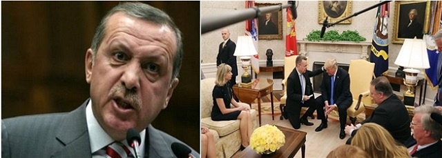Solda; ‘‘Bu fakir bu görevde olduğu sürece o teröristi alamazsın’’ diyen Recep Tayyip Erdoğan, sağda ise bağımsız Türk yargısı tarafından serbest bırakılan Rahip Andrew Brunson, Beyaz Ev Oval Ofis’te ABD Başkanı Donald Trump’a teşekkür ederken ve onu kutsarken görülmektedir.