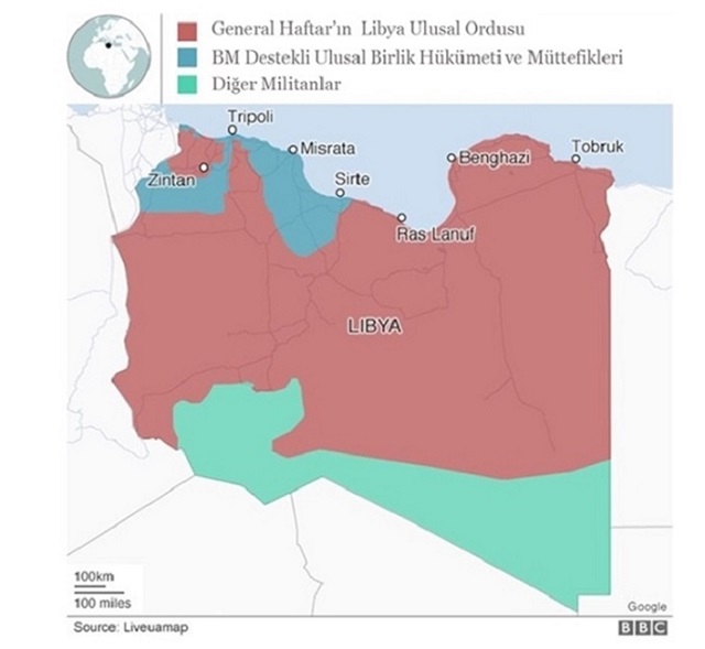Libya’da birbirine karşı üstünlük sağlamak isteyen iki ana grup var: Birincisi halen uluslararası tanınırlığı olan Fayiz el Serrac liderliğindeki Ulusal Mutabakat Hükümeti. Birileri her an artık ben bu hükümeti tanımıyorum dese ne olacak oda belli değil? Diğeri, CIA ile bağlantılı olduğu bilinen Halife Hafter liderliğindeki sözde Libya Ulusal Ordusu.