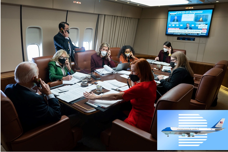 ABD Başkanı Joe Biden, eşi Jill Biden ve üst düzey yetkililer Air Force One uçağında bir brifing dinlerken, 26 Şubat 2021. Kaynak: Adam Schultz