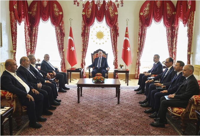 Türkiye Cumhurbaşkanlığı tarafından paylaşılan fotoğrafta Recep Tayyip Erdoğan ve hükümetinin bakanları (sağda) Hamas heyetiyle kameralara poz verirken görünmektedir.