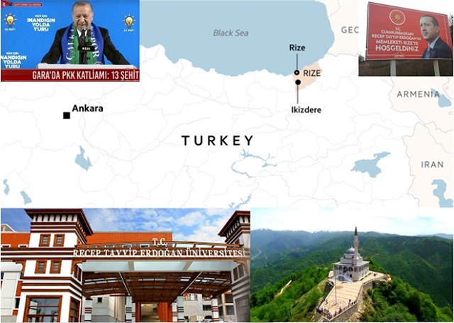 Rize’de Erdoğan kahraman statüsünü hâlâ koruyor. Yollardaki tabelalarda T.C. CUMHURBAŞKANI RECEP TAYYİP ERDOĞAN’IN MEMLEKETİ RİZE’YE HOŞ GELDİNİZ’’ yazmakta ve kentte ayrıca Recep Tayyip Erdoğan Üniversitesi de bulunmaktadır. Sağ altta Erdoğan tarafından yeniden yaptırılan Kıble Dağı Camisi görülmektedir. 2018 yılındaki cumhurbaşkanlığı seçiminde oyların %79’unu alan Erdoğan’ın dev fotoğrafları kentte binaları süslemektedir.