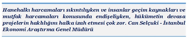 İstanbul Ekonomi Araştırma Genel Müdürü Can Selçuki; hanehalkı harcamaları sıkıntılıyken ve insanlar geçim kaynakları ve mutfak harcamaları konusunda endişeliyken hükümetin devasa projelerin haklılığını halka izah etmesinin zor olduğunu ifade etmektedir.