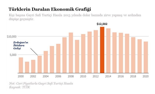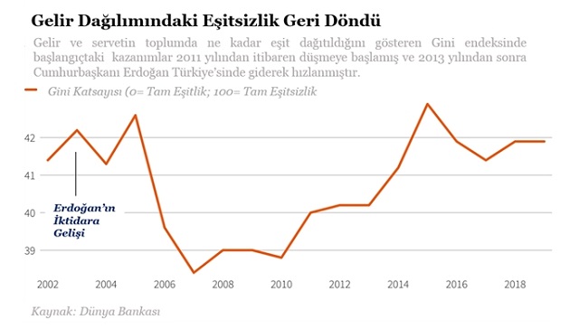 Dünya Bankası tahminlerine göre 1,5 milyondan fazla Türk geçtiğimiz yıl yoksulluk sınırının altına düşmüştür. Ve gelir ve servet dağılımını gösteren Gini endeksi de gelir dağılımı eşitsizliğinin 2011 yılından beri yükseldiğini ve 2013 yılından itibaren hızlanarak, Erdoğan’ın iktidardaki ilk on yılında, 2006-2010 döneminde elde edilen büyük kazanımları silip süpürdüğünü göstermektedir.