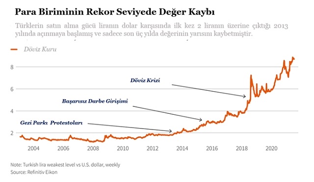 Türk lirası, son üç yılda yarısından fazla olmak üzere, 2013 yılından bu yana ABD doları karşısında değerinin %75’ini kaybetmiş durumdadır. Birçok Türk vatandaşı artık birikimlerini yabancı para birimlerinde tutmayı tercih etmektedir.