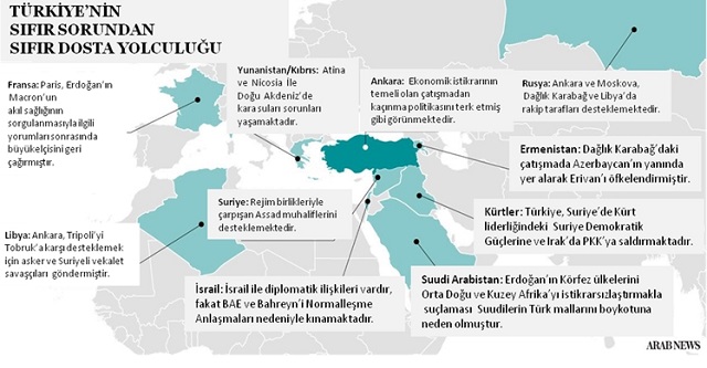 Günümüzde ise durum böylesine farklı olamazdı. Sadece 10 yıl içinde Türkiye, ‘‘komşularla sıfır sorundan’’ neredeyse ‘‘sıfır dost komşu’’ durumuna gelmiştir. Akdeniz’de gerçekleştirilen tatbikatlarda Fransız, Yunan, Kıbrıs ve hatta İsrail ile Mısır savaş gemilerinin Türk savaş gemileriyle yoğun didişmelere girdikleri görülmüştür. Kürtlerle barış görüşmelerinin yerini yeniden düşmanlıklar almış ve Ankara’nın Irak Kürtleriyle ilişkileri daha soğuk bir duruma gelmiştir.