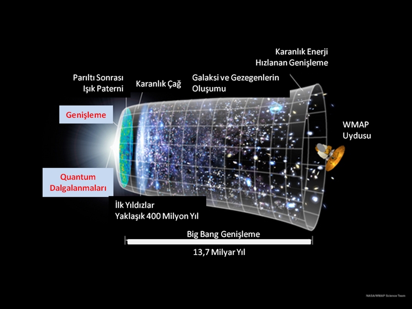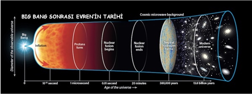 Big Bang sonrası, başlangıçta çapı çok küçük olan kâinat, günümüzde gözlemleyebildiğimiz Evren’e dönüşmüştür. Kaynak: ASTRONOMY: ROEN KELLY, AFTER BICEP2 COLLABORATION