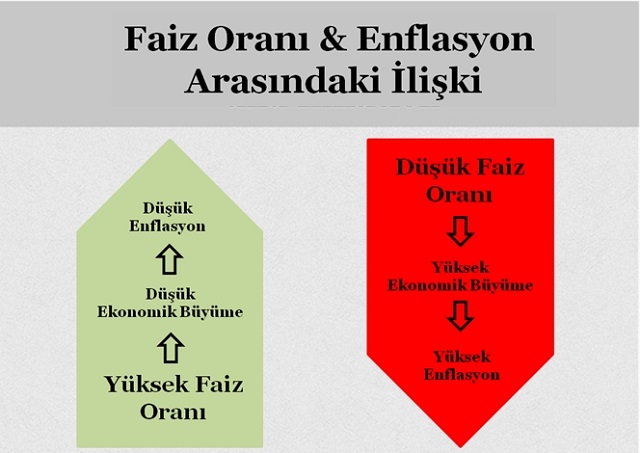 Peki, enflasyon ile faiz oranları arasındaki ilişki nedir? Enflasyon, mal ve hizmet fiyatlarının genel düzeyindeki sürekli artıştır. Enflasyon artarsa paranın değeri düşer. Enflasyon oranı ile faiz oranları arasında genelde ters bir ilişki eğilimi bulunmaktadır. Genel bir ifadeyle faiz oranları düşük olduğunda ekonomi büyür ve enflasyon artar. Tersine olarak; faiz oranları yüksek olduğunda ise ekonomi yavaşlar ve enflasyon düşer.