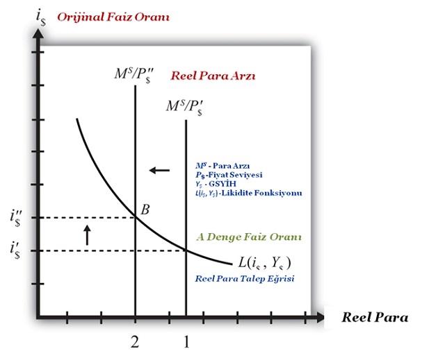 Fiyat seviyesinde bir yükselme; piyasadaki para arzı sabit olduğundan gerçek para arzında bir düşmeye neden olacaktır (MS/P$′ ¾ MS/P$″). Orijinal faiz oranında gerçek para arzı yatay düzlemde ‘‘2’’ Seviyesine düşerken, reel para talebi ‘‘1’’ seviyesinde kalmayı sürdürecektir. Bunun anlamı; piyasadaki para talebinin para arzını aşması ve reel faiz oranının yeni denge oranından daha düşük olmasıdır. Sonuç; diğer bütün değişkenler sabit kaldığında fiyat seviyesindeki yükselmenin (enflasyon) ekonomide ortalama faiz oranlarını yükseltmesidir. Tersi olarak da fiyat seviyesindeki düşmenin (deflasyon) ortalama faiz oranlarını düşürmesidir. Grafikte son denge durumu ‘‘B’’ noktasında gerçekleşecektir. Gerçek para arzı Seviye-1’den Seviye-2’ye düşerken, denge faiz oranı da ( i$′)’den (i$″)’ye yükselecektir.