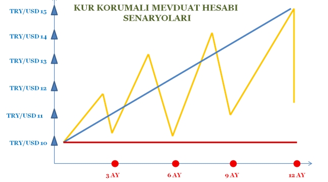 Yukarıdaki grafiği iyi analiz etmek gerekiyor. Mavi renkli eğriyle gösterilen, yani doların istikrarlı ve sürekli değer kazandığı durumda bankadan faizimizi, üzerine de TCMB ve Hazine’nin vereceği kurdan kaynaklanan farkı alıyoruz. Kırmızı renkli eğriyle gösterilen, yani TRY/USD paritesinin değişmediği veya doların değer kaybettiği durumda sadece bankanın verdiği faizimizi alıyoruz. Sarı renkle gösterilen, yani TRY/USD paritesinin oynak, sağlıksız ve ne zaman ne yapacağının bilinmez olduğu durumlarda ise vade sonunda ellerimizi Allah’a açıp, tıpkı 20-21 Aralık 2021 gecesinde görüldüğü gibi doların değerinde aşağı doğru paraşütsüz düşüşler yaşanmaması için dua ediyoruz.
