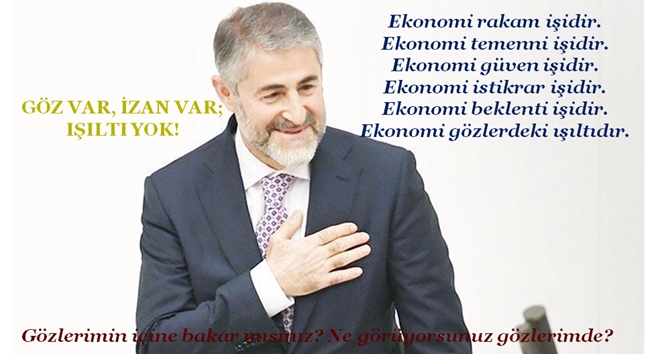 Çiçeği burnunda hazine ve Maliye Bakanı Nureddin Nebati, TRT canlı yayınında sunucunun; Dövize endeksli Türk lirası mevduat sistemine talep nasıl sorusuna; ‘‘Rakam vermeyeyim şimdi. Gözlerime bakar mısınız? Ne görüyorsunuz gözlerimde? Ekonomi rakam işi, ekonomi temenni işi, ekonomi güven işi, ekonomi istikrar işi, beklenti işi. Ekonomi gözlerdeki ışıltıdır’’ yanıtını vermiştir.