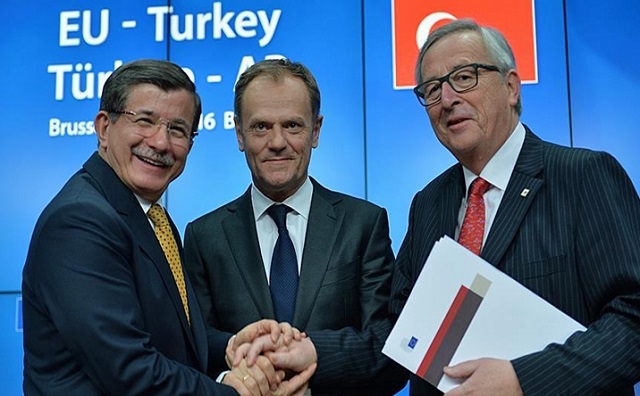 Türkiye Başbakanı Ahmet Davutoğlu, Avrupa Konseyi Başkanı Donald Tusk ve Avrupa Komisyonu Başkanı Jean-Claude Junker, Avrupa Birliği Liderler Zirvesi sonrasında kameralara poz verirken görülmektedir, 18 Mart 2016 günü. Kaynak: Dursun Aydemir – Anadolu Agency
