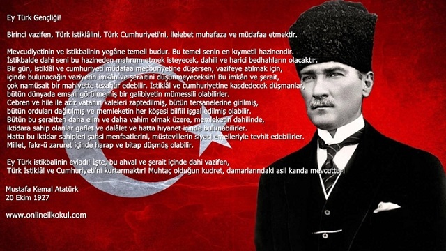 Ey Türk istikbalinin evladı! İşte, bu ahval ve şerait içinde dahi vazifen, Türk İstiklâl ve Cumhuriyeti’ni kurtarmaktır! Muhtaç olduğun kudret, damarlarındaki asil kanda mevcuttur! Başkomutan Gazi Mareşal Mustafa Kemal ATATÜRK (1927)