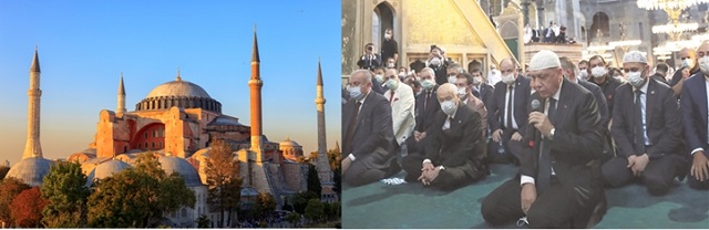 Hagia Sophia, 6’ncı yüzyılda bir katedral olarak inşa edilmiş, 14’üncü yüzyılda Osmanlılar kenti ele geçirdiğinde camiye çevrilmiş ve sonra da Atatürk idaresinde 1923 yılında laik bir tarihi yapıya dönüştürülmüştür. Geçen ay, Lozan Antlaşmasının 97’nci yıldönümünde Erdoğan Hagia Sophia’yı tekrar camiye çevirmiştir.