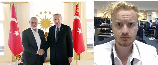 Solda Türkiye Cumhurbaşkanı Recep Tayyip Erdoğan Hamas lideri İsmail Haniyeh ile tokalaşırken görülmektedir. Sağda ise; 13 Ağustos 2020 günü kaleme aldığı yazısında Türkiye’nin Hamas üyelerine pasaport verdiğini iddia eden Telegraph Orta Doğu muhabiri James Rothwell. Kaynak: Anadolu Agency ve Great British Business Show.