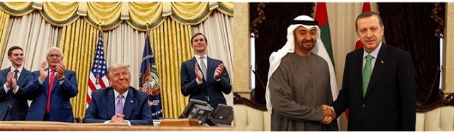 Solda; ABD Başkanı Donald Trump’ın damadı Jared Kushner tarafından ‘‘TARİHİ BAŞARI’’ olarak nitelendirilen İsrail-BAE ilişkilerinin normalleştirilmesi hakkında açıklama yaparken, sağda ise 2012 yılında bir araya gelen Birleşik Arap Emirlikleri lideri Sheikh Mohammed bin Zayed ve Recep Tayyip Erdoğan. Foto: AFP
