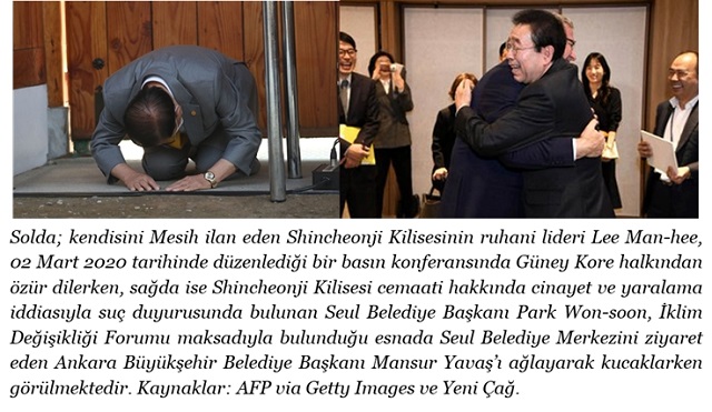 Güney Kore halkından özür dilerken yüzüne maske, koluna da altın saat takan, kendi kendine Mesih olduğunu ilan eden şarlatan Lee Man-hee’nin ruhani lideri olduğu Shincheonji Kilisesi cemaati hakkında, cinayet ve yaralama iddiasıyla suç duyurunda bulunan Seul Belediye Başkanı Park Won-soon’u da tebrik ediyorum.
