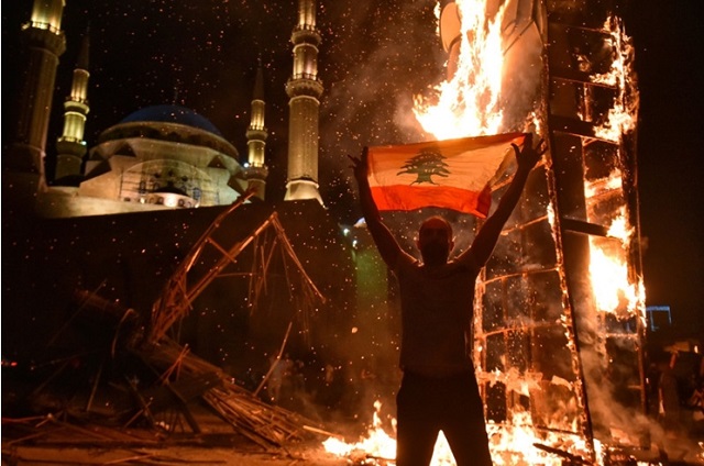 Lübnanlı bir adam, Lübnan’ın Ekim 2019 isyanının sembolü Lübnan bayrağını ‘‘Devrim Yumruğu’’ Beyrut Şehitler Meydanında havaya kaldırırken görülmektedir. Beyrut sokakları hükümet aleyhtarı göstericiler ile Hariri yanlılarının çatışmalarına sahne olmuş ve eski Başbakan istifa etmek zorunda kalmıştır. Kaynak: AFP VIA GETTY IMAGES