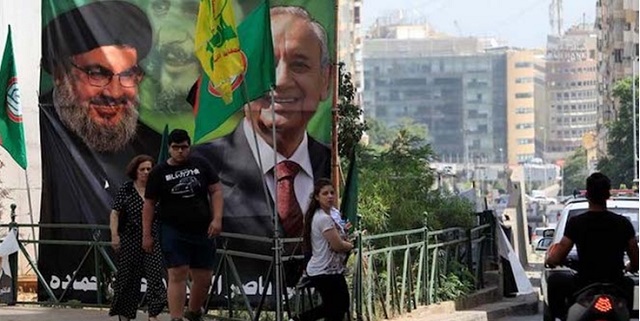 Beyrut sokaklarında Amal lideri Nabih Berri ile Hezbollah lideri Sayyed Hassan Nasrallah’ı gösteren bir kampanya afişi. 04 Mayıs 2018. Kaynak: LSE Middle East Centre Blog