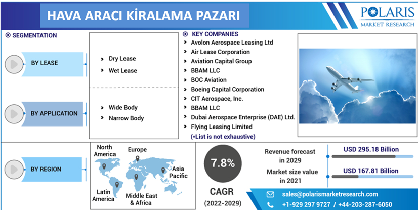 Polaris Market Search tarafından yapılan araştırma sonuçlarına göre 2029 yılına kadar yıllık %7.8 bileşik büyüme oranı ile hava aracı kiralama pazarının büyüklüğü 295.18 milyar dolara ulaşacaktır.