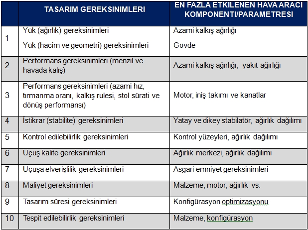 Sistem mühendisliğinin uçak tasarımına uygulanması, uçak tasarım gereksinimlerini ve işlevlerini sistem mühendisliği ilkeleriyle ilişkilendiren çok yönlü bir çalışma gerektirir. Bir fonksiyonel analiz, uçak bileşenlerinin fonksiyonları ile genel tasarım gereklilikleri arasındaki bağlantıların belirlenmesine yol açacaktır. Aşağıdaki tablo hava aracı ana bileşenleri ile tasarım gereklilikleri arasındaki ilişkiyi göstermektedir. Yükün temel olarak iki yönü vardır: (i) ağırlık ve (ii) hacim. Yükün ağırlığı esas olarak uçağın maksimum kalkış ağırlığını etkiler, ancak yük hacmi ve geometrisi öncelikle gövde tasarımını etkiler.
