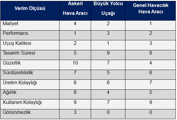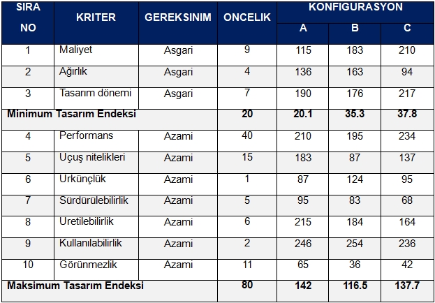 CI-Cost Index, PI-Performance Index, FI-Flying Qualities Index, TI-Period of Design Index, BI-Beauty (or scariness) Index, MI-Maintainability Index, RI-Productability Index, WI-Weight Index, DI-Disposability Index, SI-Stealthy Index. Bu tasarım hedeflerinden üç adedi, yani maliyet, ağırlık ve tasarım süresi minimize edilirken diğer yedi adet tasarım hedefi maksimize edilmelidir. Her bir tasarım opsiyonu müşteri isteklerine uygunluğu açısından değerlendirilmelidir. Yukarıdaki Tasarım Opsiyonları Tablosu benzeri bir tablo kullanılması en iyi tasarımın seçilmesini kolaylaştırır.