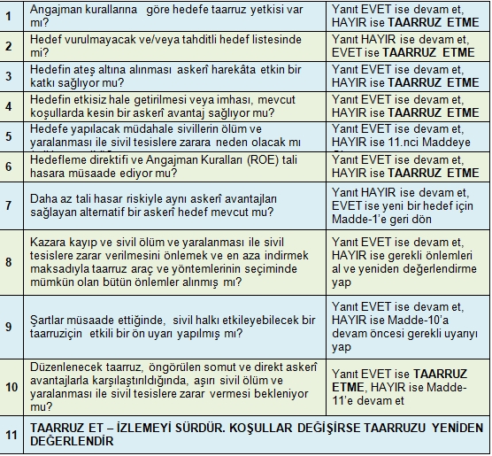 Hukuki danışmanlar, müşterek hedefleme sürecine en baştan dâhil edilmelidir. Hedefleme bir komutanlık sorumluluğudur. Hukuki danışmanlar, hedefleri Uluslararası İnsancıl Hukuk ve Silahlı Çatışma Hukuku alan uzmanları olarak ve geçerli iç ülke hukuku da dâhil olmak üzere, komutanın kuvvet kullanma yetkisi hakkındaki kısıtlamaları inceleyerek bütün hedefleme sürecini desteklerler.