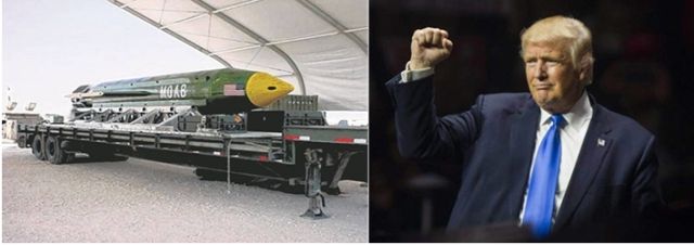 Solda A GBU-43/B Massive Ordnance Air Blast (MOAB) Eglin Air Force Armament Center, Florida. Fotoğraf: EPA/US DEPARTMENT OF DEFENSE, sağda ise kullanma emrini veren zamanın ABD başkanı Donald Trump.