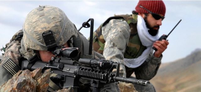 Birleşik Devletler ordusu mensubu Teğmen Jared Tomberlin (sol) ve Afganlı bir tercüman Afganistan’ın Zabul eyaletinde bir operasyon esnasında görülmektedir. 2009. Kaynak: DOD/ Staff Sgt. Adam Mancini, U.S. Army