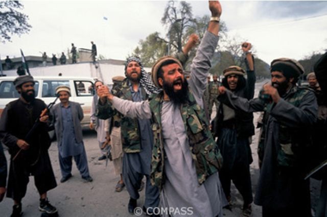 Kabil, Afganistan, 04-1992, Mücahitler, Sovyetlerin çekilmesinin ardından Afgan komünist güçlerle yaptıkları bir çatışma sonrasında zaferlerini kutlarken. Fotoğraf: Klaus Reisinger