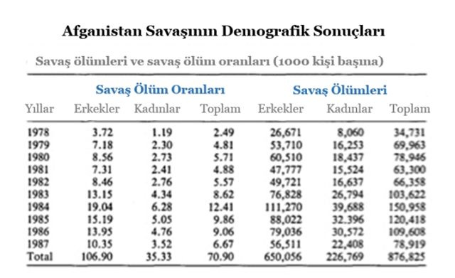 Afganistan savaşının demografik sonuçları. Kaynak: Khalidi, Noor Ahmand (1991) “Afghanistan: Demographic Consequences of War, 1978-1987,” Central Asia Survey 10,3, 107.