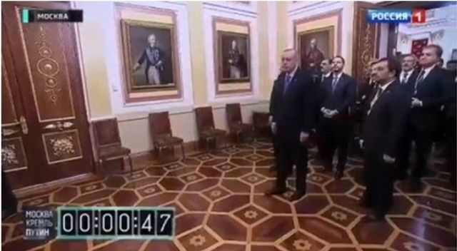 Kremlin’de Putin ile görüşmeyi bekleyen Erdoğan ve beraberindeki Türk heyeti. Görüntüler hükümet haber ajansı Russia 1 tarafından yayınlanmıştır. Kaynak: See News