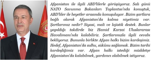 “Mehmetçik, görev aldığı tüm coğrafyalar gibi Afganistan’da da milli, manevi ve mesleki değerlerimize yaraşır şekilde görevlerini başarıyla icra etti.”