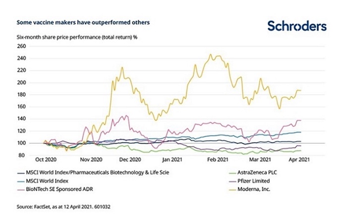 12 Nisan 2021 itibarıyla; AstraZeneca, Pfizer ve Moderna ilaç şirketlerinin performansları. Kaynak: FactSet.