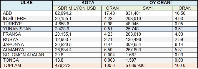Tabloda oy oranı diye bir sütun var ya işte oraya biraz bakalım. ABD’nin oy oranına dikkat ettiniz mi? Tahmin edebileceğiniz gibi tablodaki son satırdaki TOPLAM rakamlarından sonraki en büyük rakamlar ABD satırında bulunmaktadır. Eee ne var bunda? Adamların ekonomisi güçlü, hem de dünya lideriler, tabi ki en büyük rakamlar onlarda olacak diyebilirsiniz. Dediklerinizde de %100 haklı olursunuz. Zaten benim dikkat çekmek istediğim konu da ‘‘En Büyük Amerika’’ falan değil.