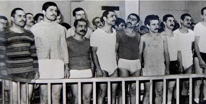12 Eylül 1980 tarihinde ABD’nin kukla generalleri tarafından gerçekleştirilen darbenin sembol fotoğrafında; hapishanelerde tek tip elbise uygulamasına direnen sanıkların mahkeme salonundaki don-atlet görüntüleri.