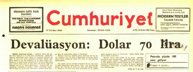 Cumhuriyet Gazetesi – 25 Ocak 1980 Manşeti – 24 Ocak Kararları ile yapılan kur ayarlaması sonucu ABD dolarının 70 lira olduğunu belirten manşet.